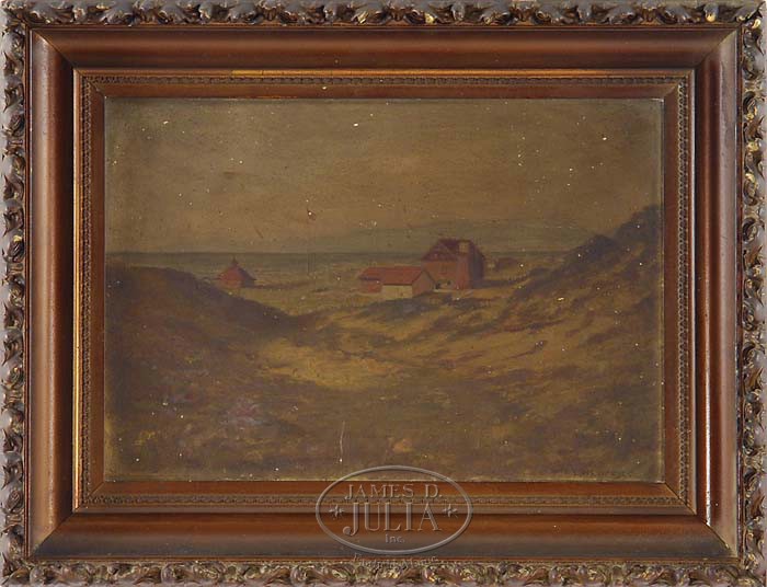 EDWARD WILSON CURRIER (American, 1857-1918) CALIFORNIA LIGHTHOUSE STATION. Oil on artist board scene shows a coastline with low beach area with sand dunes having a series of buildings and what appears to be a lighthouse in construction. Another building is separated closer to the water and in between is a flagpole flying American flag. Waves lap onto the sandy beach area and the horizon appears to have a mountain shoreline. Signed lower right “E. W Currier”. Housed in its original gesso decorated frame. SIZE: 14″ x 20″. CONDITION: Extremely dirty, otherwise very good. It is our belief that this painting will clean up extremely well. 9-95718 (1,000-2,000)