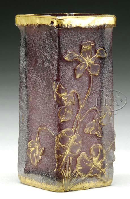 DAUM CAMEO VASE. Lovely Daum vase has cameo flowers, stems and leaves in purple against an acid textured purple background. Cameo flowers and leaves are highlighted with gilded veining and the square vase is finished with gilded lip and foot. Signed on the underside in gold “Daum Nancy” with Cross of Lorraine. SIZE: 4-3/4″ t. CONDITION: Very good with one tiny flake to bottom edge of lip band. 5-62330 (400-600)