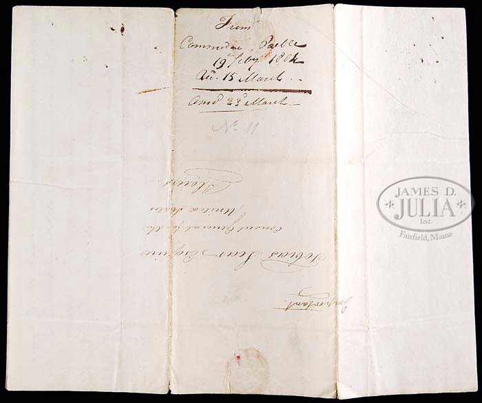Correction: The Decatur report is as indicated in the catalog a (period) copy and thus not in his hand. COMMODORE EDWARD PREBLE’S LETTER RECOUNTING BURNING OF THE PHILADELPHIA ALONG WITH STEPHEN DECATUR’S ACCOUNT. Edward Preble LS 2-1/2 pp Feb 17, 1804 on the “Constitution” detailing the burning of the Philadelphia lead by Captain Decatur without losing a man but killing between twenty and thirty “Tripolines”. A vivid blow by blow recounting the dramatic end of the ship Philadelphia. Together with this letter is a copy of Stephen Decatur’s report of the same incident. CONDITION: Very good. 9-98652 (2,000-3,000)