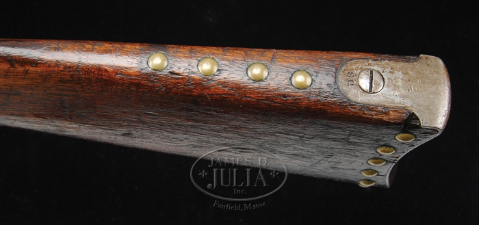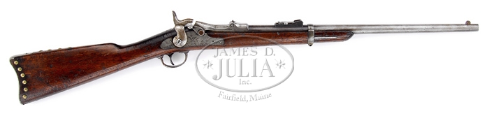 (Additional Information) Consignor notes that SN 34008 and SN 34243 are Battlefield Carbines according to the Frasca list of known Springfield trapdoors used at Little Big Horn, which leaves strong likelihood that this item was picked up at the Battlefield. INDIAN USED CUSTER RANGE SPRINGFIELD MODEL 1873 TRAPDOOR CARBINE. SN 34138. Cal. 45-70. Standard carbine with 22″ bbl, square base front sight and 1,200 yard ladder rear sight. It has high arch breech block with standard Model 1873 & eagle with crossed arrows over “US” markings and standard 1873 lockplate markings. Mounted in a post-1873 stock with 1873 carbine buttplate without trap. The stock has a narrow gap on either side of bbl & receiver and a hole in the butt, under the buttplate, has been plugged. The bbl band is missing its stacking swivel and it has 2-pc trigger guard. There are no holes drilled under buttplate, however there is some unusual milling in heel of buttstock under buttplate. There is a sling bar on left side of wrist missing its ring. There is a row of six brass tacks in butt at buttplate and four more on comb. Given the discoloration in those areas it appears they have been in place a very long time. This carbine was not tested for cartridge matches against cartridge cases recovered from Custer Battlefield as it appears that firing pin has been changed with a brass one currently installed. However, this does not preclude this carbine having been used at Little Big Horn. It has all the attributes of an Indian used gun showing hard use with missing saddle ring & stacking swivel & old brass tacks. CONDITION: Good. Traces of dark finish remain in most sheltered areas around sight and over chamber area. Balance of metal is a cleaned gray patina with scattered fine pitting, nicks & dings. Stock is sound showing heavy hard use with numerous nicks & dings having coarse sanding or cleaning marks overall and a light coating of finish. Mechanics are fine, strong bright bore with moderate pitting. 4-32343 JR443 (5,000-10,000)