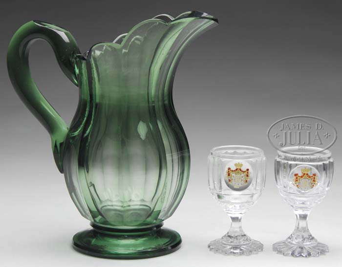 THREE PIECES OF 19TH/20TH CENTURY GLASS. 1) 9-5/8″ medium green blown pitcher with cut panel decoration throughout. A separately applied handle with two cut panels. An extremely heavy and well made piece of great form and lines. 2-3) 4″ Baccarat wine glasses decorated with a Royal crest having the initials “AM”. PROVENANCE: From the Collection of Dorothy-Lee Jones. CONDITION: Very good to excellent. 5-63102 (400-600)