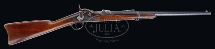 EXTRAORDINARILY RARE, HISTORIC & IMPORTANT SPRINGFIELD MODEL 1873 SADDLE RING CARBINE OF 1ST SERGEANT JOHN RYAN, CIVIL WAR VETERAN & LITTLE BIG HORN BATTLE SURVIVOR SN 39027. Cal. 45-70. This carbine is well within the Custer serial number range. As anyone who has had interest in the Custer fight at Little Big Horn will know & understand a known & documented firearm from that fight is, indeed, a very rare & desirable item. Sgt. Ryan was born Aug. 25, 1845 in West Newton, Mass. As noted in the title, Sgt. Ryan was a Civil War veteran having enlisted as a private in Company C, 28th Massachusetts Volunteer Infantry on Jan. 1, 1862 as a sixteen year old. Sgt. Ryan, with the famous 28th Massachusetts, fought in most of the major battles of the Civil War including Second Bull Run, Chantilly, Antietam, Fredericksburg, Chancellorsville & Gettysburg. In August 1864 he was wounded three times at the Battle of Reams Station. He remained out of action until his discharge in Dec. 1864. He reenlisted in the 61st Massachusetts Infantry and remained with them until final discharge in July 1865. Shortly after his discharge Sgt. Ryan reenlisted in the Cavalry & served an additional ten years which includes the time with Custer and the 7th Cavalry. He was finally discharged from the Army on Dec. 19, 1876, just six months after the Battle at Little Big Horn. He joined the Newton Police Dept. in 1878, became Captain in 1903 and retired in 1913. He died on Oct. 14, 1926 at age 81. Sgt. Ryan reenlisted in 7th Cavalry in Nov. 1866 and became a member of Company M under Capt. Thomas French. He was with Maj. Reno & Capt. French through the entire fight and wound up with Maj. Reno & Capt. Benteen atop the ridge above the river where they held out the balance of the first day and entire second day with many wounded & killed. After the Indians had departed from the battlefield and Gen. Terry’s troops had arrived, Sgt. Ryan was ordered to cover a portion of the battlefield to bury the dead. He states in his memoirs Ten Years with Custer, Barnard, that he personally buried Gen. George Custer and his brother, Tom. Sgt. Ryan returned with remnants of the 7th Cavalry to Fort Abraham Lincoln and remained there until his final discharge in Dec. 1876. He does not mention, and apparently there is no record, how he came to retain this carbine, but apparently he did so as it was purchased in about 1985 by Alex Acevedo from the John Ryan Family through someone named Brian Riba. A signed letter dated 8-14-04 from Alex Acevedo, on his Alexander Gallery letterhead stationery, certifies to this statement, which accompanies this lot. Also accompanying is a copy of the aforementioned Sgt. Ryan’s memoirs. The carbine in its own right, without the history, is simply outstanding. It is a standard issue 1873 Saddle Ring Carbine with 22” rnd bbl, square base front sight and 1300 yard ladder rear sight. It has a high arch breech block with standard “1873” markings and “1873” marked lockplate. Mounted in its orig 1-pc walnut stock with sgl bbl band with correct stacking swivel. Left side of stock, opposite hammer, has a sling bar & ring with a clear, crisp, oval “ESA” cartouche. Buttplate is authentic 1873 without trap and there is no hole in wood underneath. PROVENANCE: Ryan Family; Brian Reba; Alex Acevedo; James D. Julia Firearms Auction as Lot 1432, Oct. 2004 CONDITION: Bbl & band retain 80-85% strong orig blue with scattered light surface rust. Breechblock retains faded case colors with light surface rust. Lockplate retains dark orig blue with scattered light surface rust, while trigger guard & buttplate retain 60-70% orig blue with fine surface rust. Top of wrist has a very old plugged hole & there is a large scrape at left heel, otherwise wood is sound with minor nicks & scratches and retains 75-80% orig oil finish. Mechanics are crisp, bright shiny bore with fine pitting in grooves. 4-32356 JR505 (25,000-40,000)
