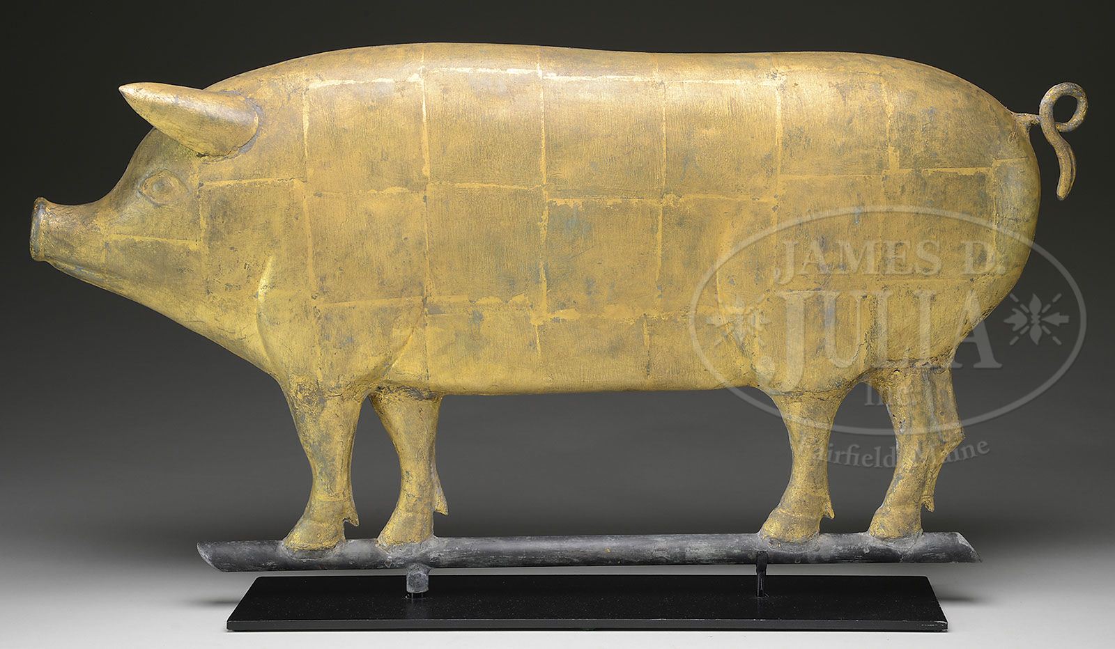 Correction: There is a typo in size. The length should be 15-3/4″ NOT 50-3/4″. FULL BODIED COPPER PIG WEATHERVANE. Late 19th- early 20th century, probably E.G. Washburne & Company, New York. This nice example with tightly curved tail and upturned snout with gilded surfaces. For a nearly identical example, reference “Copper Weathervanes”, manufactured by E.G. Washburne & Company, see page 19 in illustrated catalog of same. Also see the book “Weathervanes” by Charles Klamkin, page 118. Now offered on a museum stand. SIZE: 15-3/4″ h x 29-1/2″ l. CONDITION: Small, tight crease top of proper right hind quarter. Otherwise very good. 9-28183 (6,000-8,000)