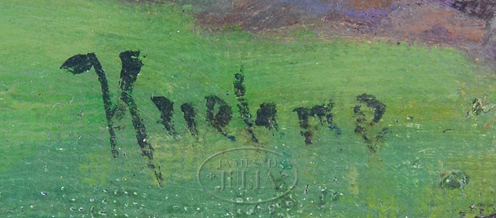MAX KUEHNE (American, 1880-1968)” GLOUCESTER MORNING”. Oil on canvas panoramic view of Gloucester Harbor showing docks with ships, boats and buildings. The distant skyline of Gloucester with church steeples and houses. Several figures walk along the edge of the harbor in the foreground. Signed lower right “Kuehne”. Titled and signed on reverse. Housed in a fine carved wood and gilt replacement frame. SIZE: 20-1/2″ x 24″. CONDITION: Very good with inpainting. 9-97020 (25,000-35,000)