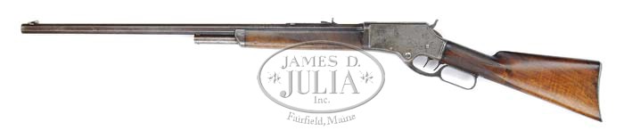 MARLIN MODEL 1881 DELUXE SPECIAL ORDER LEVER ACTION RIFLE. SN 11026. Cal. 40 (40-60). Scarce deluxe ’81 with 28″ oct bbl, half magazine, German silver Rocky Mtn. front sight & Marlin semi-buckhorn rear sight with adjustable aperture. Receiver has dbl set triggers. Mounted with very nicely figured, checkered American walnut with straight stock & semi-crescent smooth steel buttplate. It has dbl set triggers & case colored frame. The half magazine feature is very rare with only 194 produced Marlin Firearms, Brophy. PROVENANCE: Leland Clapp Collection. CONDITION: Very good. Bbl & magazine tube are mostly a silver/brown patina with orig blue in sheltered areas. Receiver retains about 75-80% silvered case colors with traces of faded colors in sheltered areas. Wood is sound with forearm showing heavy wear & a hand worn patina. Buttstock shows moderate wear with a few nicks & scratches and retains a hand worn patina with traces of orig oil finish. Mechanics are fine, strong bright bore with scattered pitting. 4-36040 JR8 (4,000-7,000)