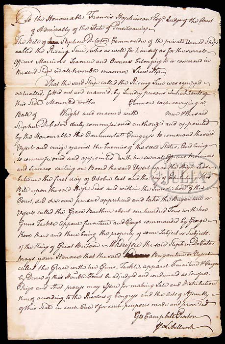 TWO LETTERS OF STEPHEN DECATUR. 1) A 1-pg. small folio containing the appeal of Stephen Decatur and crew of the “RISING SUN ” for prize money arising from the sale of the Brigantine “GRACE” captured by them. A detailed letter of the claim. 2) Together with a letter to Francis Hopkinson, Judge of the Court of Admiralty for the State of Pennsylvania regarding the bill of “Stephen de Cater”(sic) Commander of the Privateer “ROYAL LOUIS” requesting the prize money for sale of contents of the ship “ACTIVE”. CONDITION: Minor staining otherwise good. 9-98644 (350-550)