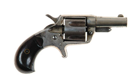 COLT NEW LINE SPUR TRIGGER REVOLVER. Cal. 41 RF. SN 9023. Nickel finish with 2-1/4” etched panel tapered rnd bbl, half moon front sight with birdhead rosewood grips. CONDITION: Good to very good. Overall retains 30-40% original nickel with the flaked areas light patina and a polished back strap. Grips retain about 80% original varnish, and the handspring is either broken or missing, otherwise mechanics are fine. Bbl panel is completely legible and has strong bore with moderate pitting. 4-53096 JR583 (300-500)
