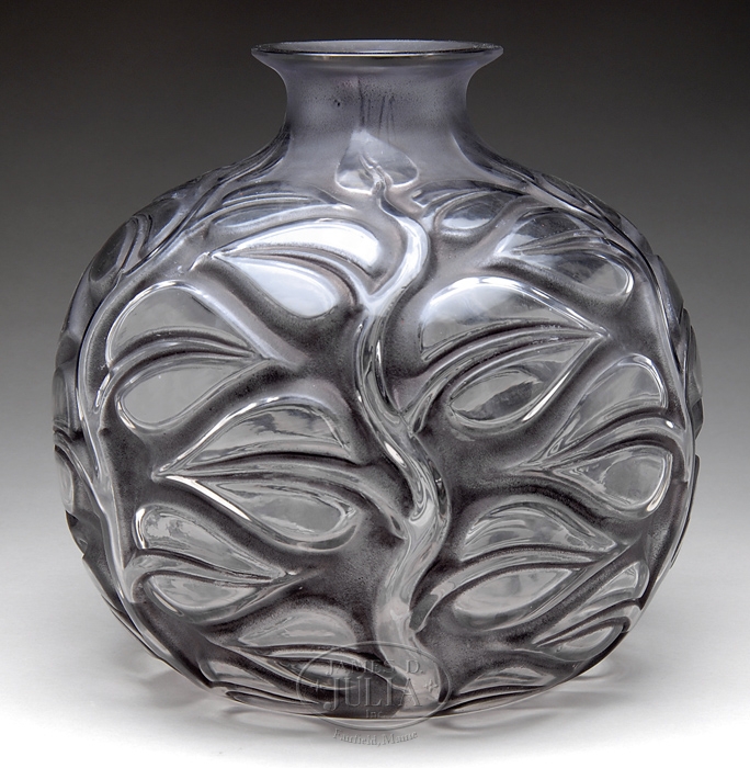 R. LALIQUE SOPHORA VASE. Nice Lalique vase has clear glass deeply impressed stylized leaf and vine design with a gray patinated background. Signed on the underside with etched block letters “R. Lalique”. SIZE: 10″ t. CONDITION: Rim has been reduced, otherwise very good. 5-66646 (2,000-2,500)