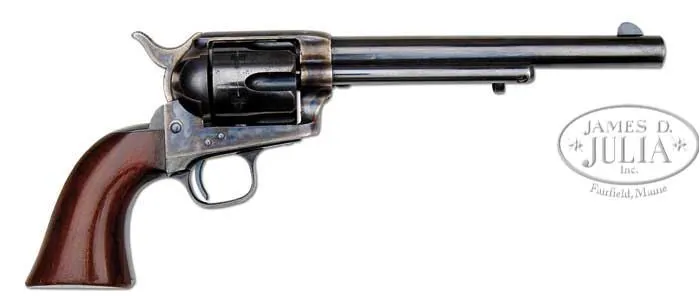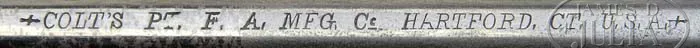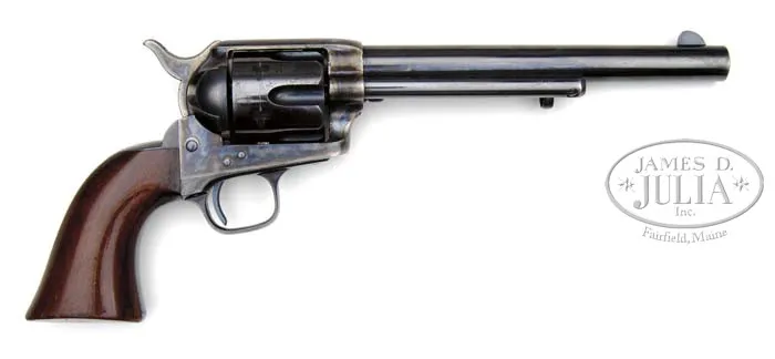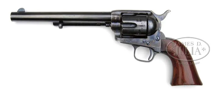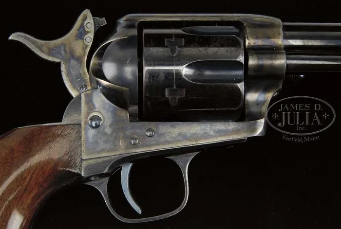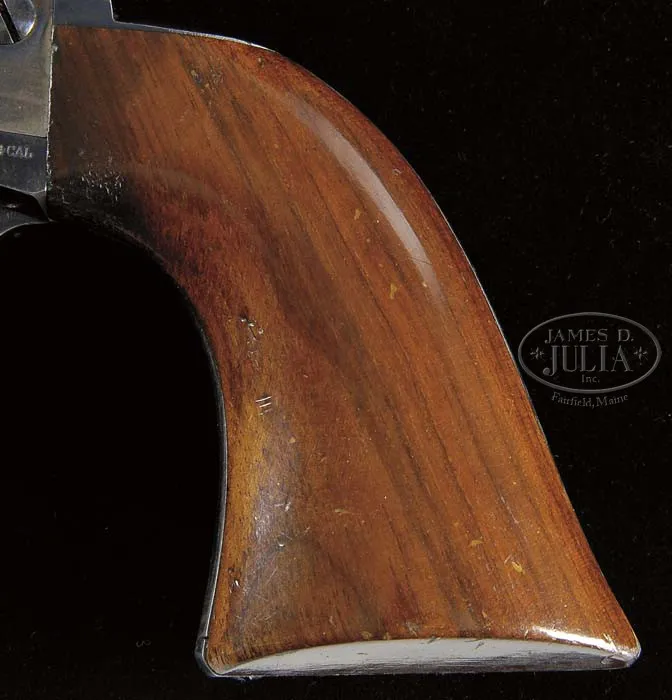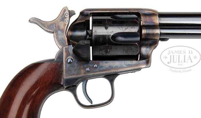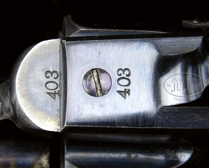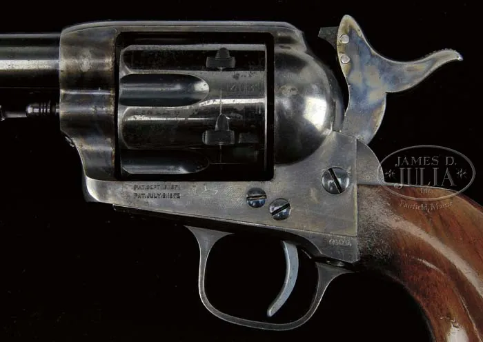 EXTRAORDINARY, FINEST OF ITS TYPE KNOWN IN THE WORLD, COLT RIMFIRE SINGLE ACTION ARMY REVOLVER. SN 403. Cal. 44 RF Henry. Blue & color case hardened with 7-1/2″ bbl, full front sight and 1-line script letter address. Left side of frame has 2-line patent dates and left shoulder of trigger guard is marked “44 CAL”. Ejector housing is first type with bull’s eye ejector rod head and bottom of bbl has a tiny “44” just forward of base pin. Mounted with a varnished 1-pc walnut grip with SN in back strap channel. Cylinder is usual 6-shots with short chambers for the rimfire cartridge and has a tiny “C” on rear face. Base pin is orig with dimpled ends. Hammer has the rimfire nose secured with two rivets with a rectangular notch in the frame. Hammer spring is orig with no roller groove and toe of butt strap has the heavy bevel as does the front end of ejector housing. SN was observed in usual places on frame, trigger guard, butt strap, bottom of bbl under ejector housing and cyl. According to Flayderman’s Guide to Antique American Firearms and The Book of Colt Firearms, Wilson, there were about 1,800 of these rare revolvers produced in the period 1875-1880, which number also included 107 revolvers produced in caliber 22 utilizing 44 caliber frames. By the time these revolvers came to the market the centerfire cartridge was well established and very little demand for this ctg. was realized on the American market. Colt Firearms, being the enterprising company that it was, and seeing the declining market for rimfire ctg. arms, promoted these revolvers to areas of the world where the Henry & Winchester Model 1866 firearms were still in popular use. Therefore the vast majority of the factory rimfire revolvers were sold throughout Mexico and South & Central America. Of those, the vast majority were routinely altered in various manners, usually having their bbls shortened. In addition they saw hard & continuous service in every conceivable climatic condition with little or no maintenance and are rarely found today with any orig finish or grip let alone high orig finish. This revolver, by all accounts of some of the most notable & authoritative Colt Single Action dealers & collectors, is the single finest rimfire single action extant. PROVENANCE: George Lewis Collection; Fred Sweeney Collection; John Henry Hill Collection; Wes Adams Collection; David Kinsey Collection CONDITION: Extraordinarily fine, all matching including bbl, cyl & grip. Bbl retains 96-97% glossy orig factory blue with slight muzzle edge wear and some very minor, very light flaking. Ejector housing retains 95-96% glossy orig blue, thin around front edge and with some minor flaking. Frame & hammer retain virtually all of their crisp, brilliant orig factory case colors with only light fading on the left recoil shield & loading gate. Top edge of hammer is lightly faded. Trigger guard retains about 92-93% glossy orig blue with front strap moderately flaked with some candy striping. Back strap retains about 85% orig factory blue, glossy & bright at top and mostly on butt strap. Center of back strap is somewhat thin with candy striping. Cyl retains about 90% glossy orig blue, strong & bright in flutes with some fine spots of rust, lightly flaked on outer diameter. Grip is sound with a very few, very minor light nicks & scratches and retains virtually all of its brilliant orig factory varnish. Mechanics are crisp, brilliant shiny bore with two small spots of pitting. Revolver appears to have been fired, possibly one cyl full with some light rust on cyl face. Chambers of cyl retain most of their strong orig factory blue with some light flaking. Bore also retains most of its orig factory blue. Screws are crisp and retain about all of their bright orig factory blue. This is a truly extraordinary opportunity to own the single finest known rimfire single action in the world. 4-36667 JR59 (175,000-275,000)