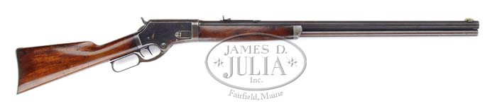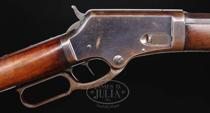 MARLIN MODEL 1881 LEVER ACTION RIFLE. SN 9244. Cal. 40 (40-60). Standard grade rifle with 28″ oct bbl, full magazine, German silver Rocky Mtn. front sight & Marlin semi-buckhorn rear sight with adjustable aperture. It has 2nd type receiver with solid carrier & dbl set triggers. Mounted with nicely figured, slab-sawed uncheckered American walnut with straight stock & smooth steel semi-crescent buttplate. Left side of forearm, at receiver, has crudely carved small initials “W.J.B”. Accompanied by a Marlin Firearms Co. letter identifying this rifle as caliber 40-60 with 28″ bbl, set trigger & shipped Sept. 8, 1885. There were only 16,379 Model 1881s ever made and of the total only 2,929 had set triggers. Reference Marlin Firearms, Brophy. PROVENANCE: Leland Clapp Collection. CONDITION: Fine to very fine. Bbl retains 80-85% dull orig blue turning plum in areas. Magazine tube has a couple of removed dents & is overall a plum patina with blue in sheltered areas. Receiver retains about 80% thin glossy orig blue with candy striping & turned plum on bottom. Wood is sound with a series of small bruises on forearm & usual nicks & scratches elsewhere with forearm retaining 60-70% orig varnish with a hand worn patina. Buttstock retains most of its orig varnish with some dark oil staining around receiver. Mechanics are crisp, bright shiny bore with scattered fine pitting. 4-36016 JR75 (5,000-8,000)