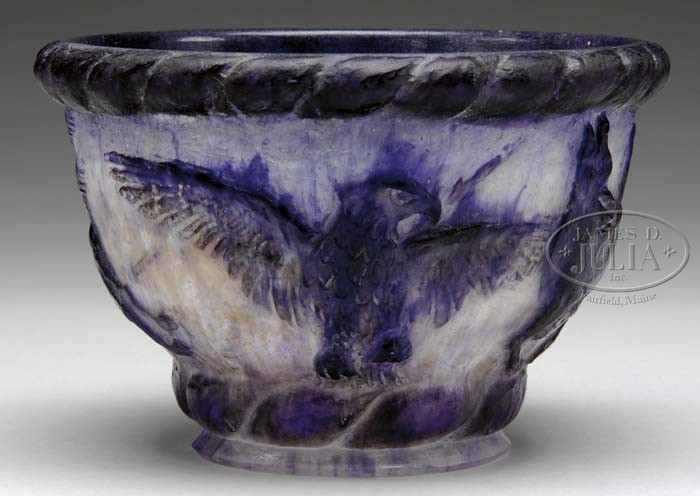 ARGY ROUSSEAU PATE-DE-VERRE HUNTING SCENE BOWL. Wonderful pate-de-verre bowl has hunting scene of deer, boar and birds with arrows showering down upon them. The figures are done in purple-blue glass against a mottled yellow and cream background. Bowl is finished at top and bottom with a purple glass rope border. Signed on the side “G. Argy Rousseau”. SIZE: 6-1/2″ dia x 4-1/4″ t. PROVENANCE: From the Private Collection of Dorothy Lee Jones. CONDITION: 3/4″ long chip on edge of foot below signature. 5-61715 (700-1,000)