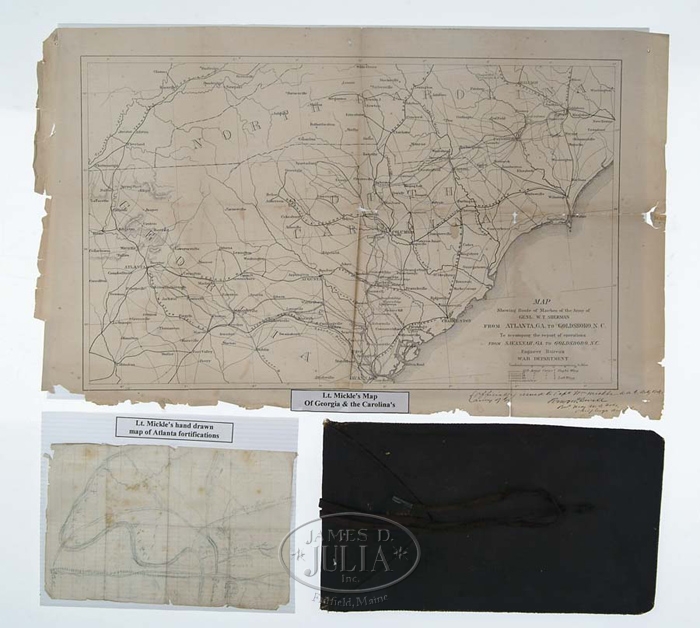 MAP CASE AND MAP BELONGING TO CAPTAIN W.H. MICKLE, 134TH NEW YORK. This lot contains a tarred linen case with flap 10” x 5”. Two maps are contained, one is 8” x 5” hand drawn, showing part of the Resaca, Georgia battlefield. The other map is about 19” x 12”, being a printed map, printed in the lower right corner reads “MAP Showing Route of Marches of the Army of Genl. W.T. Sherman FROM ATLANTA, GA. TO GOLDSBORO, N.C. To accompany the report of operations FROM SAVANNAH, GA. TO GOLDSBORO, N.C. Engineer Bureau, WAR DEPARTMENT”. Written in period brown ink, bottom margins of this map reads “Officially issued to Captain William Mickle, A.A.G. Artillery Brgd. Army of Georgia” signed by “R.M. McDowell, Bvt. MA. Chief Engr. Army of GA”. CONDITION: Tarred linen bag is excellent, missing button for closure. Hand written map soiled, foxed, chipping around edge. Printed map is dry-mounted with chipping around edges, cracks at folds, small paper label glued to bottom of map. Maps in linen case are still very displayable. 4-56153 JS206 (500-1,000)