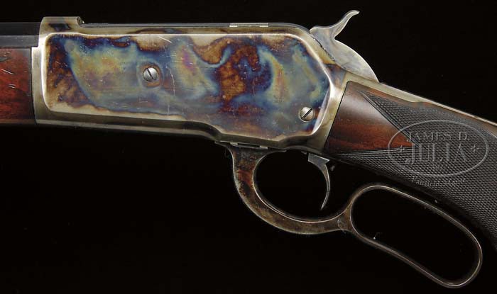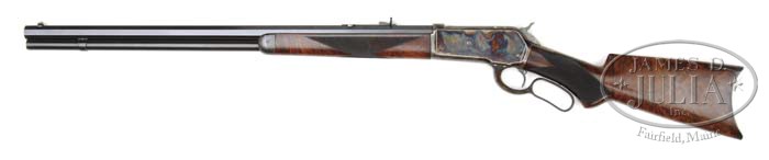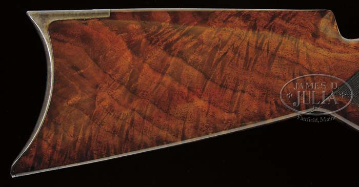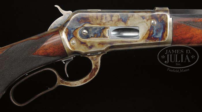 FINE DELUXE WINCHESTER MODEL 1886 LEVER ACTION RIFLE. SN 89431. Cal. 40-65. Beautiful deluxe ’86 with 26″ oct bbl, full magazine, half nickel front sight & semi-buckhorn rear sight. Mounted with very beautiful, highly figured, center crotch American walnut with “H” style checkered forearm & serpentine grip buttstock with black triangle inlay and crescent steel buttplate. Receiver has sgl set trigger. Left side of lower tang, under the wood, is stamped with assembly number “407” and “XXX”. Top tang channel of buttstock has the assembly number “472” with matching number “472” inside toe of buttplate. Accompanied by a Cody Firearms Museum letter which identifies this rifle in caliber 40-65 with oct bbl, set trigger, checkered pistol grip stock & Lyman rear & combination front sights. PROVENANCE: Wes Adams Estate Collection. CONDITION: Very fine plus. Bbl & magazine tube retain 98-99% strong orig factory blue with only a few scattered spots of light surface discoloration; receiver retains about all of its orig case colors, strong & bright on sides, receiver ring & top tang; belly of receiver is moderately faded; hammer retains virtually all of its orig case colors, brilliant on rear edge, lightly faded on sides & top edge; sides of lever retain strong case colors, lightly to moderately faded on the outer faces; forend cap retains strong bright case colors and buttplate bright case colors on tang, lightly to moderately faded on outer face; wood is sound with a few scattered, light nicks & scratches and retains about all of its orig piano varnish finish. Mechanics are crisp, bright shiny bore. 4-44473 JR412 (20,000-30,000)