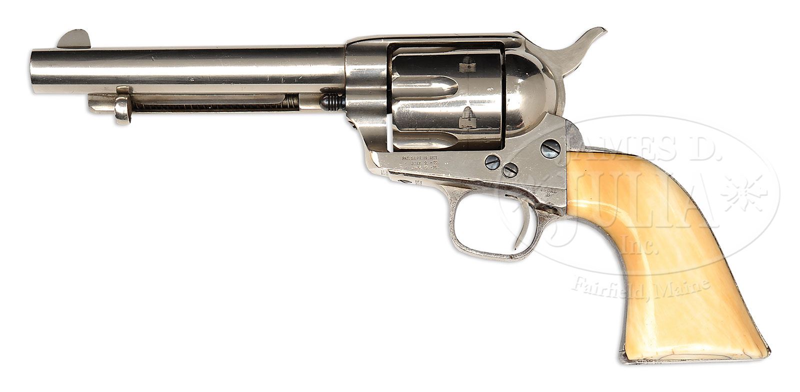 COLT SINGLE ACTION ARMY REVOLVER WITH PALL MALL LONDON ADDRESS. SN 37155. Cal. 45 Boxer. Nickel finish with 5-1/2″ bbl, full front sight and 1-line block letter “HARTFORD PALL MALL LONDON” address. Left side of frame has 3-line patent dates and left shoulder of trigger guard the caliber marking. Bottom of bbl & cyl have tiny British proofs. Mounted with 1-pc smooth ivory grip that is made in the orig style of two slabs of ivory attached to two wood spacers. Ejector housing is second type with bull’s eye ejector rod head. According to Colt Peacemaker Encyclopedia, Cochran, of the 357,859 Single Actions produced from 1873 to 1941 only 729 were in caliber 450 Boxer. This revolver will letter in its current caliber with nickel finish, 5-1/2″ bbl, type of stocks not listed and shipped to Colt’s London Agency on Oct. 10, 1878 in a 30-gun shipment. CONDITION: Extremely fine, all visible numbers matching. Bbl, cyl & grips are unnumbered; overall retains most of its strong orig nickel with the majority of the losses on the front & backstraps which are cleaned gray metal; screws & base pin retain most of their orig fire blue; trigger guard & left side of trigger plate have small dings; cyl retains most of its orig nickel showing very little use; ejector housing also retains about all of its orig nickel. Grip is sound with age lines and retains a fine ivory patina on left side, faded to lighter ivory patina on right side with myriad small age lines. Hammer is not solid in safety or half cock notches, otherwise mechanics are fine, bright shiny bore with a few scattered tiny spots of pitting; hammer spring has been changes. 4-48793 JR353 (4,000-7,000)