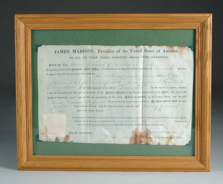 FRAMED EARLY DEED SIGNED BY JAMES MADISON. This deed, printed on parchment, is dated “18 April 1815”. It is for a quarter section of land in Zanesville, Ohio, sold to Franz Germund. It is signed “James Madison”, the future President of the United States, who was at that time, the Commissioner of the General Land Office. Mr. Germund is an ancestor of John Hamilton, the well-known author & collector from Ohio. CONDITION: Fine. Lightly soiled with some rusty water stains at top & bottom edges and with a couple of folded creases, otherwise is completely clear & legible. From the collection of the late John Hamilton. 4-52162 JR428 (200-300)