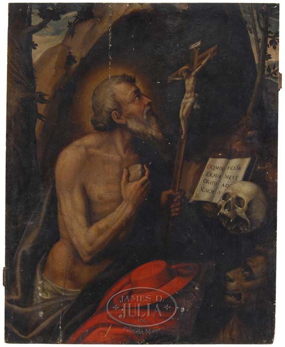UNSIGNED (Italian, Possibly 17th Century or Earlier) OLD MASTER WITH SKULL AND LION. Oil on wood panel shows a man with white hair and white beard clutching a stone in his right hand with a white cloth draped body. He holds a tall crucifix in his left hand while his red hat and coat are resting below. A book is open with the works “Domin Eclamr Exavdi Mevs Orato AD Nemen V”. A human skull rests on the bottom corner of the book just above a lions head. A landscape with cave is the backdrop. Single wood panel has two supporting cleats on the back. SIZE: 31-1/2” x 25-1/4”. CONDITION: There are cracks which have chipped edges and some light chipping elsewhere. 9-73561 LG (10,000-20,000)