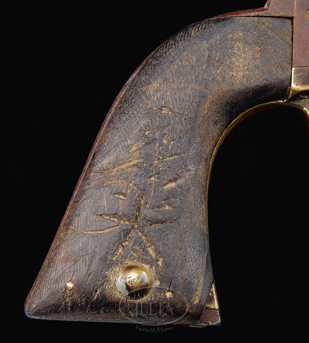 RARE EXCAVATED INDIAN USED COLT 1860 ARMY PERCUSSION REVOLVER ASSOCIATED WITH CUSTER’S BATTLE AT LITTLE BIG HORN. SN 168886. Cal. 44. Fine relic condition ’60 Army that is still fully loaded, including caps on nipples. It has usual 8″ rnd bbl with brass trigger guard & iron backstrap and 1-pc walnut grip that has five early brass tacks on left side and one complete brass tack on right side with two square pins from other brass tacks. Both sides of grip are lightly carved with right side having burnt file decorations and a 5-pointed star that has been previously associated with Northern Cheyenne owned firearms. Accompanied by a letter dated 5/4/94 to Pennie Goodman of Pineville, Missouri from Bernard Wood of Milwaukee, Wisconsin as a follow-up to the sale of this revolver. Mr. Wood states that this revolver came from the estate of Charles P. Werms of Milwaukee and had been in his collection for many years. Mr. Werms reportedly told Mr. Wood that he had purchased it from an antique store in Sioux Falls, South Dakota where it had been obtained from a gentleman who ran a general store & grocery store around Busby, Montana in the early 1950’s. He states that the Indian residents of Crow Reservation & Cheyenne Reservation frequently traded with him and he had obtained this revolver in the 1920’s. The Indian who brought it in to him “got it from the grave of one of his ancestors who was buried in the Big Horn Canyon after the Custer fight”. Mr. Wood states he believes this fellow was from the Cheyenne reservation. He goes on to explain that the Big Horn Canyon was where some of the Indian participants of the Custer Fight retreated to rest up for a while and some of their dead were buried there. Big Horn Canyon today is under about 70 feet of water from Yellowtail Dam. Also accompanied by what appears to be a page from Indian Guns, Spears & Shields of our American Frontier, John Baldwin which lists & pictures this same Colt as item #258. CONDITION: Typical relic with heavy dark brown rust patina with heavy pitting on left side of cylinder, frame & rear area of top of bbl, with other heavy pitting on rammer handle. Rammer latch is missing and has been missing likely from before it was buried. Trigger guard has a blackish brass patina, thinned to a dark mustard patina on trigger bow & front strap. Grip has a crack through one of tack pins and has chipped toes and shows heavy wear with a dark patina. This revolver is not functioning and no attempt was made to operate any of movable parts or to remove any of the encrusted soil. 4-32335 JR358 (7,500-17,500)