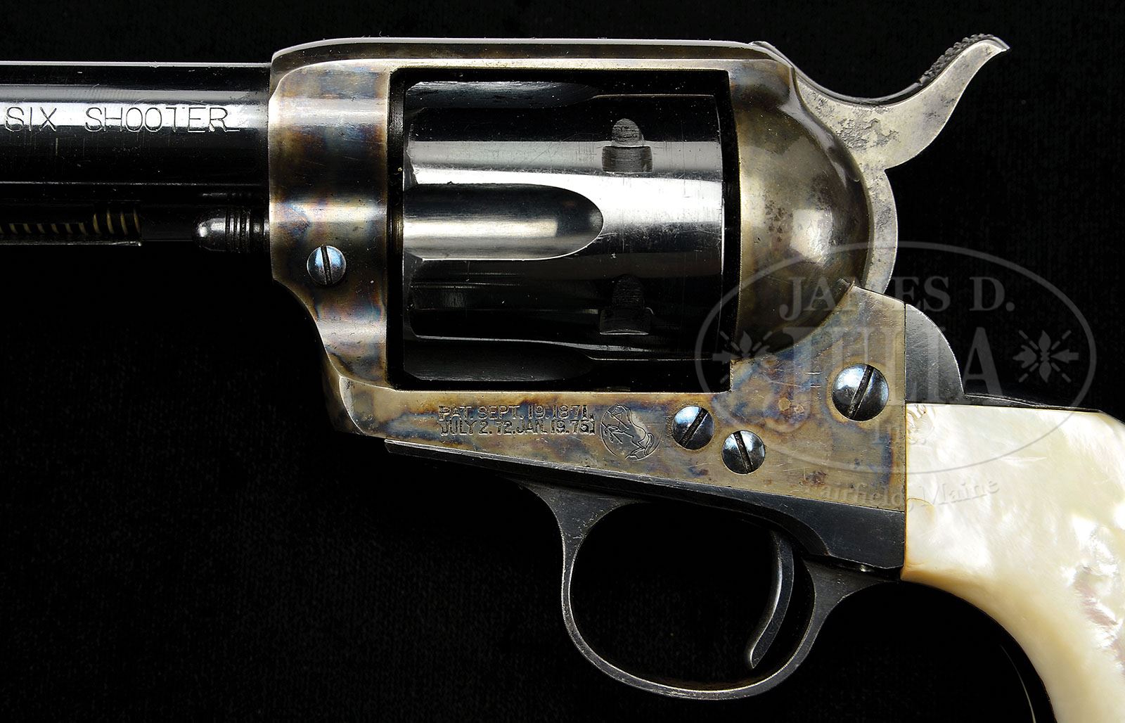 *COLT FIRST GENERATION FRONTIER SIX SHOOTER SINGLE ACTION ARMY REVOLVER. SN 227085. Cal. 44 WCF (44-40). Blue and color case hardened with 7-1/2″ bbl, full front sight, 1-line block letter address and “COLT FRONTIER SIX SHOOTER” roll marked on left side. Left side of frame has 2-line patent dates and Rampant Colt in broken circle. Mounted with fine 2-pc pearl grips with raised carved ox head on right side. Inside of right grip scratched with name “JOHN DAMON”. Accompanied by Colt factory letter identifying this revolver as: .44/40 cal, 7-1/2″ bbl, blue finish, shipped to M. Hartley & Company, New York, NY on June 3, 1902, with a 10-gun shipment. PROVENANCE: Robert Howard Estate Collection. CONDITION: Extremely fine, all matching except cyl and grips which are unnumbered. Overall retains virtually all of its orig factory finish with glossy bright blue on bbl and ejector rod housing with only slight muzzle edge wear. Cyl & grip frame also retain strong bright blue with some minor flaking on backstrap. Frame retains brilliant case colors in sheltered areas, lightly to moderately faded elsewhere. Hammer is moderately pitted on both sides, having been cleaned. Left grip has repaired chip in toe, otherwise grips are fine with great fire & color. Mechanics are crisp, bright shiny bore. 4-48777 JR6 (6,000-10,000)