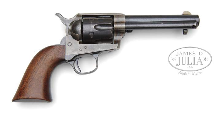 EXTREMELY RARE SAMUEL LOMBARD HART COLT SINGLE ACTION ARMY REVOLVER WITH TOMBSTONE, ARIZONA HISTORY. SN 111703. Cal. 45 Colt. Blue & color case hardened with 4-13/16″ bbl that has a fine even round crown and relocated half moon German silver front sight with 1-line block letter address. Left side of frame is marked with 3-line patent dates and a small “U.S.” overstamped with two hearts surmounted by two sets of “SL” initials. Mounted with 1-pc walnut grip that has last four digits of SN in back strap channel with “DFC” (David F. Clark) sub-inspector initials on the bottom left edge, also overstamped with a single heart and the “SL” initials. SN was observed in the usual three places on bottom of revolver with “DFC” sub-inspector initials on the frame and the “mystery” “G” inspector initial on trigger guard & butt strap. Bottom of bbl, under ejector rod housing, has the last four digits of SN along with the “DFC” initials and “P” proofs along with a tiny “G” proof near the ejector rod housing stud. Cyl also has last four digits of SN, “DFC” sub-inspector initials and a small “P” proof. Ejector rod housing is 2nd type with bull’s eye ejector rod head and base pin is orig with dimpled ends. This extraordinarily rare Single Action Army revolver falls within the 9th Government Contract of 2,000 revolvers produced in the period August 1884 through January 1885. It is apparent that Mr. Hart, a gunsmith in Tombstone, AZ, a Civil War veteran and a Captain in the Wisconsin Infantry arrived in Tombstone in about May of 1880 and opened his gun shop. He remained in Tombstone on the voting rolls until about 1886. There are several other known firearms similarly marked by Mr. Hart, only two or three of which are Colt SAAs. It is beyond doubt that this revolver, along with the other two known specimens were part of the same Government Contract and were probably purchased by Mr. Hart either directly from Colt, or through a distributor for resale in his gun shop. The years of the middle-1880’s were extraordinarily violent & dangerous in that area of southern Arizona with numerous outlaw factions and Indians raiding throughout the area. It stands to reason that this Colt was purchased by an area resident for personal protection or by someone in law enforcement or even an individual on the other side of the law. Regardless of who owned it it is an extremely rare & desirable piece of history from the great American southwest. Accompanied by a Colt factory letter identifying this revolver in caliber 45, bbl length & type of stocks not listed, blue finish and shipped to the U.S. Government Inspector at the Colt Factory on Oct. 24, 1884 in a shipment of 200 same type firearms. Also accompanied by a packet of several pages of correspondence between the consignor and a gentleman by the name of Atterbury from the 1974 period wherein they discuss two of these revolvers, one of which is this exact one and the other which belonged to Mr. Atterbury with the SN 112050 which was shipped Oct. 30, 1884 in a 150 gun shipment. Additionally accompanying are copies of a 5-page article by Mr. Atterbury which appeared in the December 1974 Gun Report wherein he discusses his S.L. Hart marked Colt Single Action and mentions this revolver. Also accompanying are two copies of muster rolls of Samuel L. Hart, Captain Company D, 41st Regiment, Wisconsin Infantry. They are dated 1864. Not only is this a rare single action it is a doubly rare & desirable western collectible suitable for even the most advanced collection or especially for an Arizona museum collection. PROVENANCE: Atterbury CONDITION: Very fine to extremely fine, all matching including grip & cylinder. Bbl retains 92-93% strong orig Colt blue with some slight thinning on left side. Ejector rod housing also retains about 92-93% strong orig blue, slightly thinned on outer radius. Frame retains strong case colors in the gullets & sheltered areas fading to smoky colors elsewhere. Screws retain generous amounts of orig blue and the hammer most of its very strong case colors. Cyl retains 70-75% thinning orig blue with sharp edge & high point wear. Trigger guard & back strap retain 85-90% strong orig blue with candy striping on front strap & trigger bow and some light thinning on back strap. Base pin retains much orig blue. Grip is sound with light edge wear and retains most of its orig oil finish with crisp markings on bottom left edge. Mechanics are crisp, brilliant shiny bore. May have been fired but there is no evidence as the bore retains strong orig blue and the chambers most of their orig blue. 4-42246 JR14 (25,000-35,000)