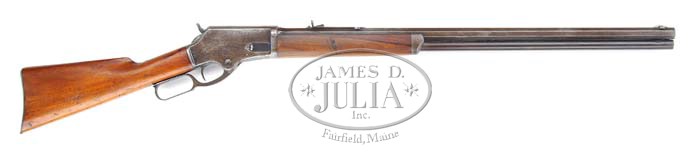 MARLIN MODEL 1881 LIGHTWEIGHT LEVER ACTION RIFLE. SN 9749. Cal. 40 (40-60). Standard grade rifle with 28″ oct bbl, full magazine, German silver Rocky Mtn. front sight & Marlin semi-buckhorn rear sight. It has 3rd type frame that measures 1.034″, with solid carrier. Mounted with nicely figured, slab-sawed, uncheckered American walnut with straight stock & smooth steel semi-crescent buttplate. Mr. Clapp’s note regarding this rifle states that he purchased it March 18, 1990 from Ray Mathews of Dawson Creek, British Columbia, Canada. He states that Ray had this rifle for approx. 55 years. It came from an uncle of his stepmother who owned a mine in Butte, Montana, who probably purchased the rifle new. PROVENANCE: Leland Clapp Collection. CONDITION: Very good. Bbl retains a thin plum/brown patina with edge wear & a few scattered small spots of discoloration. Magazine tube is a dark plum/brown patina. Receiver retains about 30% thin orig finish, stronger in sheltered areas. Lever & hammer retain case hardening turned silver. Stock has a small hole in bottom & there is a gouge in forearm, otherwise wood is sound with usual nicks & scratches. Forearm retains traces of orig varnish being mostly a hand worn patina. Buttstock retains about 80-85% orig varnish. Mechanics are fine, bright shiny bore. 4-36007 JR67 (4,000-6,000)