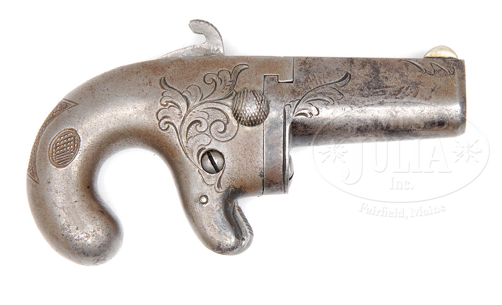 NATIONAL FIRE ARMS CO. 1ST MODEL 2″ BARREL, IRON FRAME DERINGER. SN 2047. cal .41 short rim fire. Marked on top bbl flat “NATIONAL ARMS CO.” Marked on bottom of bbl “PAT. FEB 24, 1863”. The short bbl models were made throughout production, with no more than 400 being produced. PROVENANCE: L.D. Eberhart Collection. CONDITION: This exceptionally scarce iron frame 2nd Model with a 2″ short bbl was originally made with a silver plated iron frame and a blued bbl. Only traces of blue are apparent on the bbl in the SN area as well as the original Moore patent dates of February 24th, 1863. Only 15% of the original blue is remaining on the bbl. Iron frames throughout the production only occurred about 10-15% at the time, so they are somewhat scarce and hard to find. It has the original knife blade ejector. 4-47504 DE121 (900-1,500)