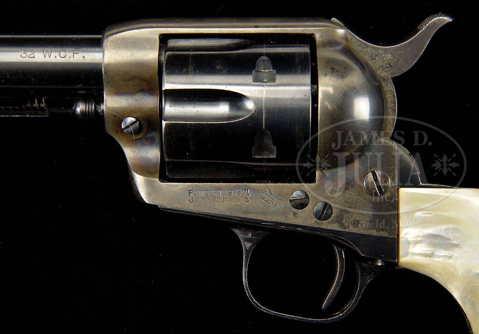 *PRE-WWII COLT SINGLE ACTION ARMY REVOLVER. SN 346213. Cal. 32 WCF (32-20). Blue & color case hardened with 7-1/2″ bbl, slightly reduced front sight and 1-line block letter address with caliber marking on left side. Left side of frame has 2-line, 3-patent dates and rampant Colt. Mounted with 2-pc pearl grips that have a raised carved ox head with gold covered horns on right side. It also has one red stone in its left eye with its right side stone missing. Accompanied by what is probably its orig rampant Colt hard rubber grips. Right side of front & backstraps, under the grip, have matching SN and rear face of cyl has last two digits of matching SN. CONDITION: Very fine. Bbl & ejector housing retain 96-97% crisp orig blue with some light muzzle edge & front end wear; frame retains bright case colors in sheltered areas, faded elsewhere; hammer retains faded case colors; trigger guard & backstrap retain most of their orig blue turned plum on front & backstraps; cyl retains about 95% orig blue. Pearl grips are a little large, are sound and show great fire & color; hard rubber grips are also sound with one small nick and light diamond point wear. Mechanics are crisp, bright shiny bore. 4-48773 JR327 (4,000-6,000)