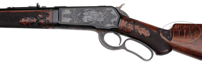 *RARE SPECIAL ENGRAVED DELUXE TAKEDOWN WINCHESTER MODEL 1886 LEVER ACTION RIFLE. SN 145592. Cal. 33 WCF. Extremely rare rifle with 24″ tapered rnd bbl, takedown, half magazine with full matted top, pedestal mounted ivory bead hunting front sight and flat-top semi-buckhorn rear sight. Left side of bbl, takedown ring & receiver are stamped with British proofs. Mounted with very highly figured center crotch 3X American walnut with style-D carved forearm and capped pistol grip stock with Winchester solid red recoil pad. Carved & checkered wood consists of large checkered panels with carved oak leaves & acorns. Receiver is engraved by Angelo Stokes with the large vignette of a cougar standing on a precipice on the left side with the small vignette of a grizzly bear on loading gate base and a larger vignette of a grizzly bear on the right forward flat. These vignettes are all surrounded by extremely well-executed foliate & floral arabesque patterns with beautiful heart motif borders. Top of receiver is engraved to match with a large leaf pattern over the receiver ring. The takedown ring is engraved to match with the heart shaped border on the bbl at the takedown ring. Sides of lever & hammer are also engraved with matching shell patterns and foliate arabesque patterns. Top tang is also engraved. Bottom of receiver is engraved with the large oval vignette of a standing, face-on bull elk surrounded by foliate & floral arabesque patterns. There are additional foliate patterns around the lever opening with decorative borders. Outer face of lever is also engraved as is the top of the hammer nose and there is a band of engraving around the muzzle. Left side of lower tang is stamped with assembly number “851” and “406” which has been obliterated and “XXX”. Top tang of buttstock has the X’d out “406” number and the replacement “851” assembly number. Bottom of stock and forend cap have sling eyes. Accompanied by a Cody Firearms Museum letter identifying this rifle in caliber 33 with matted takedown rnd bbl, plain trigger, fancy pistol grip stock, half magazine, shotgun butt with Silvers recoil pad, special engraving and lists “80 hours Stokes (name of person who worked on gun), carved style D $10.00” and screw eyes, received in warehouse Nov. 10, 1909, shipped Apr. 29, 1910 to Order #256114. Received back at factory May 28, 1910, Work Order #29957 and re-shipped with the same description to Order #191784. Given the elaborate special engraving & carved wood along with the British proofs, it seems likely that this rifle was originally prepared for an exhibit and subsequently sold to a customer. PROVENANCE: Dr. James M. Goforth Collection; Wes Adams Estate Collection. CONDITION: Extremely fine plus, all matching, probably unfired. Overall retains virtually all of its orig factory finish to both metal & wood with bright orig blue and crisp varnish; wood is sound with a minor nick or two in the finish and some hand grease in the checkering; lever & hammer retain about all of their orig case colors, brilliant on sides, faded on top edge of hammer and outer face of lever. Mechanics are crisp, brilliant shiny bore. Bolt face retains about all of its orig factory blue as does the loading gate. 4-44458 JR303 (28,000-60,000)