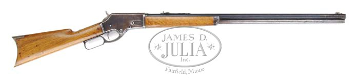 MARLIN MODEL 1881 LIGHTWEIGHT LEVER ACTION RIFLE. SN 22059. Cal. 38-55. Standard grade rifle with 28″ oct bbl, full magazine, German silver Rocky Mtn. front sight & slightly altered Marlin semi-buckhorn rear sight. Mounted with uncheckered straight grain American walnut with straight stock & crescent buttplate. PROVENANCE: Leland Clapp Collection. CONDITION: Good. Bbl retains 75-85% strong orig blue showing wear around front sight and on edges. Magazine tube is mostly a silver/brown patina. Receiver retains 30-35% orig blue mixed with patina, worn silver over top & bottom edges. Wood is sound and retains about all of a refinish. Mechanics are fine, strong bore with moderate pitting. 4-36039 JR10 (1,500-2,500)