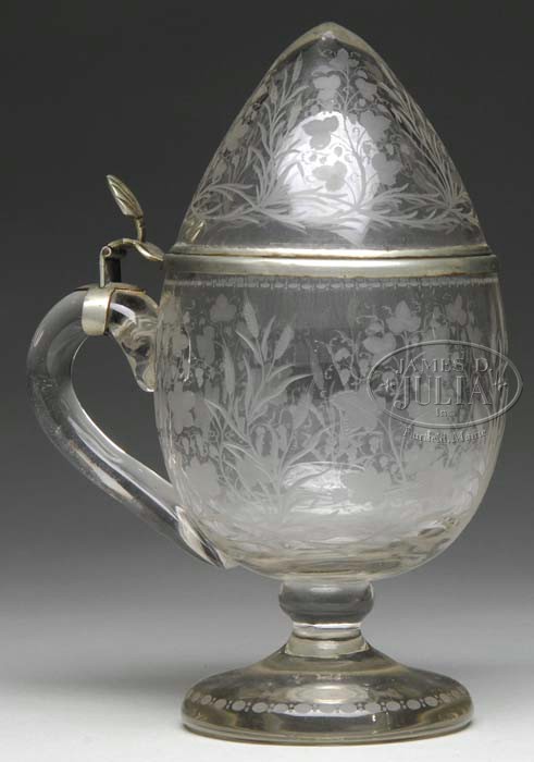 ETCHED GLASS STEIN. Interesting egg shaped stein has etched flowers and leaves encircling the body and cone shaped lid. The stein is finished with an applied clear glass handle and pewter rim. Unsigned. SIZE: 8″ t. PROVENANCE: From the Collection of Dorothy-Lee Jones. CONDITION: Very good to excellent. 5-63832 (100-200)
