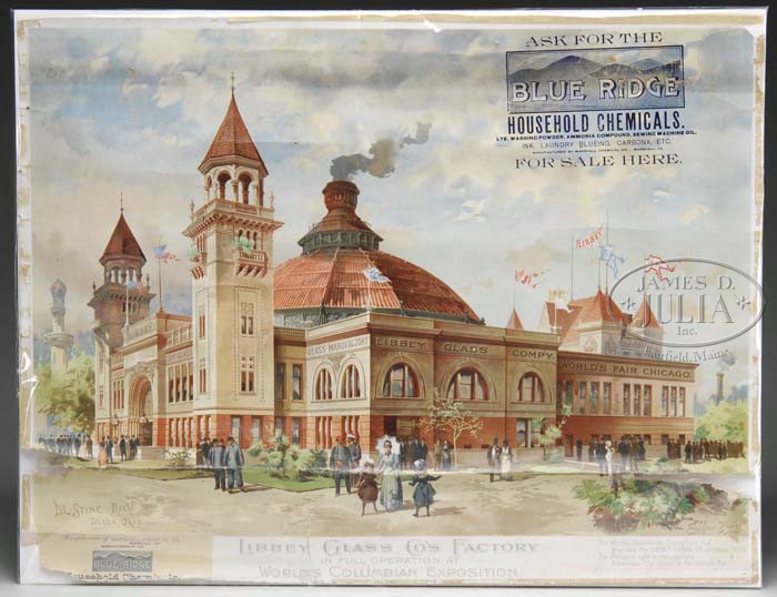 RARE LIBBEY GLASS ADVERTISING POSTER MADE FOR THE WORLD’S COLUMBIAN EXPOSITION. This colorful paper advertising poster titled in a banner below “Libbey Glass Co’s Factory in Full Operation at World’s Columbian Exposition”. Image depicts in full color the actual Libbey building as it appeared at the exposition replete with flags, banners and Libbey banner. The image was complements of Marshall Chemical Co. of Marshall, Virginia and their firm is also advertised on the poster named “Blue Ridge”. These printed posters were apparently distributed by Blue Ridge and used as a promotion. Three of these posters were discovered in 2003 in an old closed out store. The two previous ones were sold at our previous auctions; this is the last of the three. SIZE: Approx. 21” x 29”. CONDITION: Generally good with various imperfections. The print itself shows various roll creases, the outside edge of border shows remnants of tape at one time and the bottom third has a serious crease that goes the entire length of the picture and there was a tear (and loss of paper) approx. 4” in from the right side and a couple of inches in from the left side. There is also a small loss of paper at the bottom and in the very top right corner. Color is reasonably strong for this rare image. 5-62266 (400-800)
