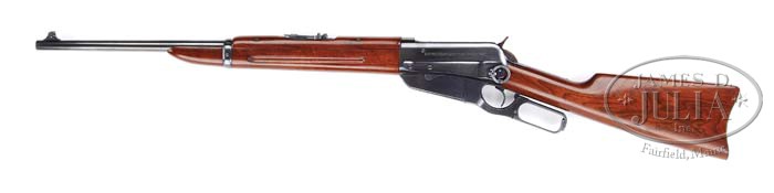 *FABULOUS RESTORED WINCHESTER 1895 SRC. SN 89731. Cal. 303 British. 22″ rnd bbl, integral base with pin fine gold bead front sight, 1800 yd military ladder rear sight. Standard receiver with usual patent dates on left side and stud and ring. Mounted with straight grain walnut, straight grip, steel carbine buttplate, 13-3/8″ forend, finger grooves on side and handguard over top of bbl. CONDITION: Extremely fine, appears new from outstanding restoration by Turnbull. Metal retains virtually all of fine factory quality restored blue finish with just a couple very minor handling marks. Hammer has virtually all fine restored case color finish. Stock is sound with a couple minor handling marks and retains all of fine factory quality restored finish. Mechanics are crisp with a nice shiny bore. 4-39783 BDT150 (2,000-3,000)