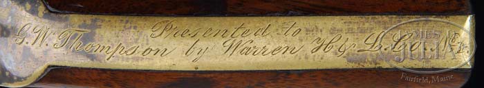 SCARCE PRESENTATION MODEL 1849 POCKET PERCUSSION REVOLVER. SN 201187. Cal. 31. Usual configuration with 4″ oct bbl, brass pin front sight and 2-line Hartford address with dashes. It has 6-shot cylinder with stagecoach holdup scene and “COLTS PATENT” on left side of frame. It also has silver plated large brass trigger guard & back strap and 1-pc walnut grip. Back strap is inscribed in period script “Presented to / G.W. Thompson by Warren H. & L. Co. No. 1”. No information was readily obtainable on either Mr. Thompson or the Warren H. & L. Co. CONDITION: Very good, all matching including wedge (grip was not checked). Bbl has been cleaned to a gray metal patina with a few spots of discoloration. Rammer pivot retains dark case colors. Cylinder retains about 80% thinning orig blue and about 95-96% strong stagecoach holdup scene. Three of six safety pins are prominent. Frame retains about 75% faded case colors and hammer traces of case colors. Trigger guard & back strap retain about 60% orig silver plating with balance a light mustard patina. Grip is sound showing light edge wear and retains most of its orig varnish. Mechanics are fine, strong bore with moderate to heavy pitting. 4-35937 JR47 (2,500-4,000)