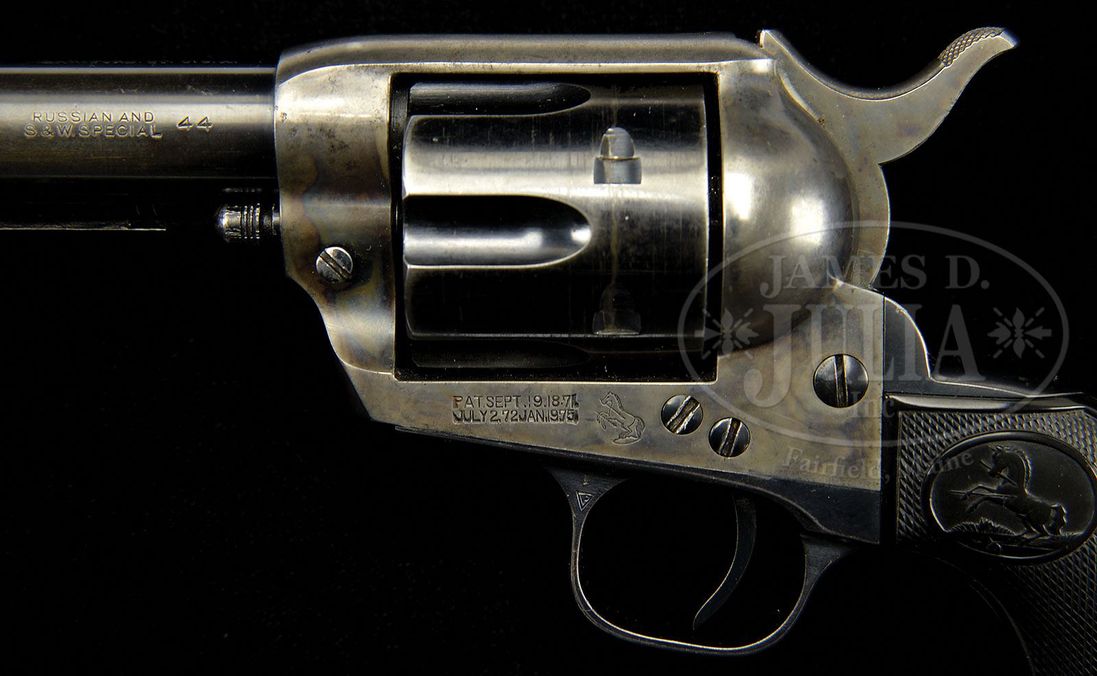 *SCARCE DUAL CALIBER COLT SINGLE ACTION ARMY REVOLVER. SN 340071. Cal. 44 Russian and S&W Spcl. Blue & color case hardened with 4-3/4″ bbl, full front sight and 2-line address with caliber marking “RUSSIAN AND / S&W SPECIAL 44”. Left side of frame has the 2-line, 3-patent dates and the rampant Colt in a partial circle. Left side of front & backstraps have the matching SNs and rear face of cyl has last two digits of matching SN. Mounted with rampant Colt hard rubber grips that are probably orig to this revolver. CONDITION: About fine, all matching except grips which are unnumbered. Bbl retains 75-80% strong orig blue with holster wear on left side; ejector housing retains about 80% orig blue; frame & hammer retain most of their orig case colors, moderately to heavily faded, bright in front gullets and strong in sheltered areas; trigger guard retains strong orig blue and the backstrap strong blue at the top and on buttstrap being mostly a blue/brown patina elsewhere; cyl retains 80-85% strong orig blue. Grips are missing small chips from the rear edges and has a chip on right bottom edge, otherwise are sound showing moderate to heavy wear. Mechanics are crisp, bright shiny bore. 4-48774 JR332 (5,000-8,000)