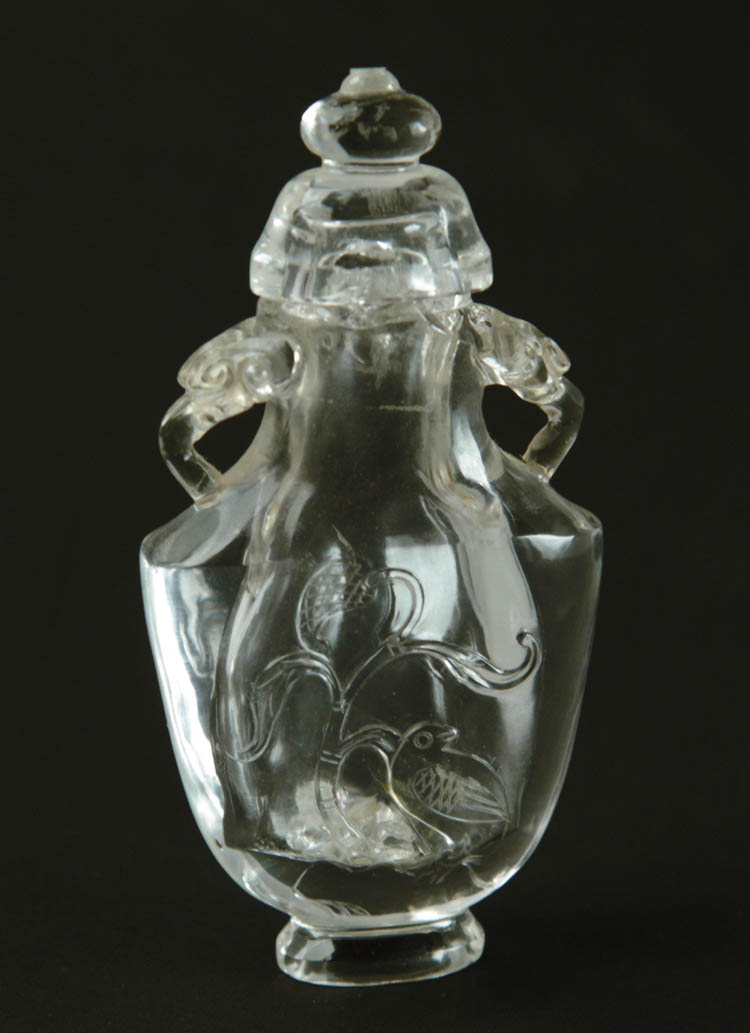 CARVED CLEAR QUARTZ SCENT BOTTLE. Body of bottle is carved with a flower and bird. The handles on each side of the bottle are carved in the form of elephant heads. SIZE: 4 3/4″ tall. CONDITION: Considerable damage to the rim of the bottle. 5-67116 (100-200)