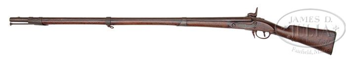 VIRGINIA MANUFACTORY 1812 TYPE MUSKET LATE STYLE CONVERTED TO PERCUSSION. SN NSN. Cal. 69. Standard configuration, with “P” proof at rear of bbl. Lockplate is marked “VIRGINIA Manufactory” in front of hammer with “RICHMOND” and “1818” vertically on tail of lockplate. It has been converted to percussion with brazed-on bolster to bbl, and large round bodied percussion hammer added, (possibly S. C. Robinson) as was done to many Confederate States altered specimens. Stock has no visible military markings. Initials “AGF” are hand carved into left side of stock, with “AF” behind sideplate. CONDITION: Fair to good. Metal parts are an even chocolate brown matte patina overall. “P” on rear of bbl in-filled with brass, probably from the process of brazing-on conversion bolster. “Virginia” on lock is relatively strong. “Manufactory” is illegible. “Richmond” and “1818” are strong. Stock has an old refinish over numerous marks and stains, with repaired cracks on right side in front of lockplate, and 3/8″ x 10″ sliver of wood repaired on right bbl channel. 4-45776 MGM163 (2,000-3,000)