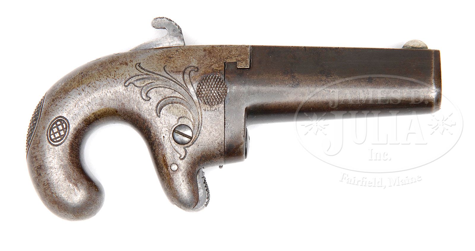 COLT’S DERINGER PAT. F.A. MFG. CO., HARTFORD CT. USA. SN 3889. 1st model with English proofs. It is fitted with a shell ejector. Its original finish was blued bbl and silver plated frame. Probably sold through the 14 PALL MALL agency in London. PROVENANCE: Elliott Riggs Collection, L.D. Eberhart Collection. CONDITION: This first model Colt was originally finished with a silver plated iron frame and blued finish on the bbl. The frame has no original silver remaining, but is not pitted and has a pleasing overall gunmetal gray finish mixed with patina. 41 Cal is stamped below the bbl release button. The engraving is strong. The bbl screw retains most of its original fire blue. There is a small amount of original blue remaining where the SN is and the British proofs are. The rest of the bbl has faded to patina through lack of proper care. The top bbl flap has a perfect Colt address The hammer retains over 50% of its cased color as does the trigger. 4-47502 DE118 (1,500-2,000)