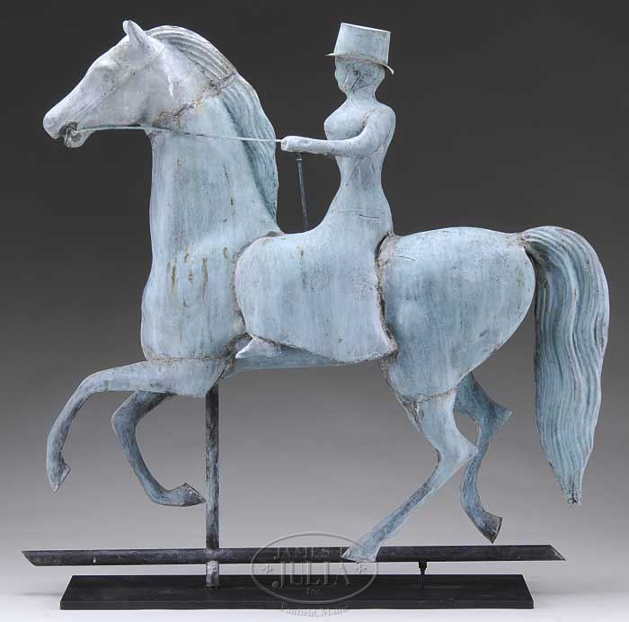 RARE VERDIGRIS MOLDED COPPER AND ZINC FORMAL EQUESTRIAN WEATHERVANE. Third quarter 19th century. Attributed to A.L. Jewell, Waltham, MA. This fine example depicting a female rider in full dress and high hat seated erect on a prancing horse with weathered green surfaces. Offered with museum stand. NOTE: A similar example sold at Christie’s, New York January 2006, Lot 416. A nearly identical example illustrated The Art of the Weathervane by Steve Miller, page 69. SIZE: 27″ h x 28″ l. CONDITION: Very good with untouched surfaces. 9-26048 (10,000-15,000)