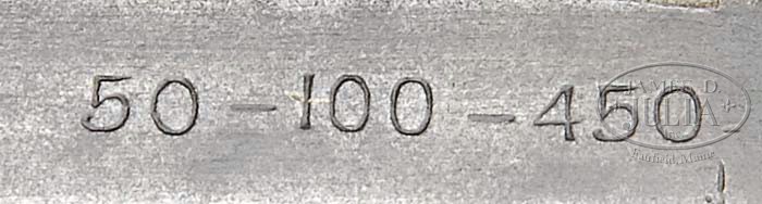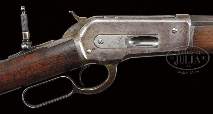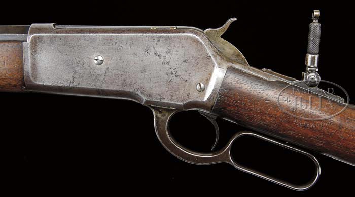 VERY RARE WINCHESTER MODEL 1886 IN 50-100-450. SN 110686. Cal. 50-100-450. 22″ oct bbl, half magazine, Lyman ivory bead hunting front sight, 2-leaf flip-up rear sight. Top flat of bbl is marked “MANUFACTURED BY THE / WINCHESTER REPEATING ARMS CO. NEW HAVEN. CONN. U.S.A.” Adjacent receiver “50-100-450”. Standard receiver top tang equipped with Lyman peep sight. Mounted with straight grain walnut, uncheckered straight grip, steel shotgun buttplate, standard forend with nose cap. Accompanied with Cody Firearms Museum Winchester letter identifying as 50-100 cal., 22″ oct bbl, plain trigger, Lyman hunting front and rear and leaf sights, half magazine, shotgun butt. Received in warehouse November 2, 1896. Shipped November 6, 1896 on order 22144. Additionally, 241 Model 1886 Winchesters were produced in 50/100/450 caliber as found in a previously compiled survey of the Model 1886 Winchesters. Inspection of inside tangs reveals assembly number 29 on left side of lower tang. Matching 29 can be found on back of buttstock and inside toe of buttplate. CONDITION: Good to Very Good. Bbl retains a brown and silver patina mix. Front half has some shallow surface pitting. Receiver is mostly a silver patina blended with some brown with some areas of shallow surface pitting. Stock is sound with expected nicks, dings & scratches. Has had comb slightly modified for tang sight and retains an open-grain oil finish with hand-worn patina through grip. Forend is sound with expected nicks, dings & scratches and retains an open-grain oil finish blended with hand-worn patina. Mechanics are crisp with slightly dark bore with distinctive rifling and some scattered shallow pitting. 4-40838 BDT223 (7,500-12,500)