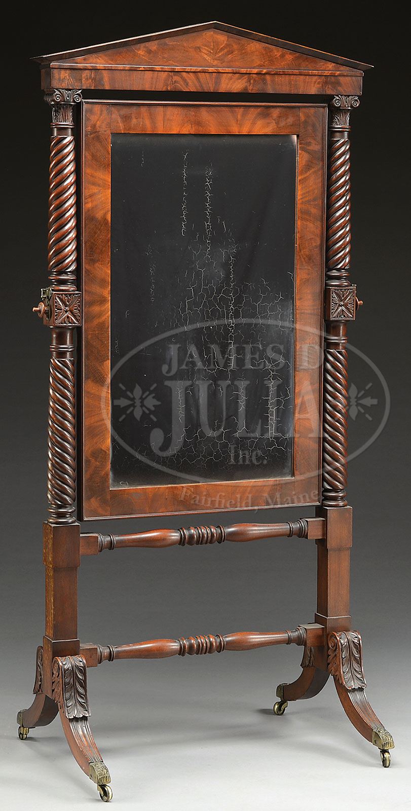 WILLIAM IV MAHOGANY CHEVAL MIRROR. Second quarter 19th century, England. The rectangular mirror plate within a figural mahogany frame hinged and tilting within a frame. The frame with architectural cresting raised on rope twist reeded column headed by Doric capitals blocked at the center and joined to the mirror with threaded rods additionally mounted with candle arm brackets. The posts on square blocked supports joined by baluster-turned stretchers raised on downswept reeded tapering legs headed by acanthus carved scrollwork fitted with cast-brass capped casters. SIZE: Height: 70-1/2″. Overall width: 34-1/2″. Depth: 23″. PROVENANCE: From a fine Maine and New York private collection. CONDITION: Very good with original polished surfaces and mirror plate, candle arms absent. 9-29886 (800-1,200)