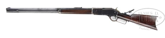 RARE SPECIAL ORDER WINCHESTER 1876 LEVER ACTION RIFLE. SN 8347. Cal. 45-75. 28″ half rnd, half oct bbl, full mag, slightly modified Rocky Mountain front sight, 1876 marked ladder rear sight, usual bbl markings. Early receiver with screwed on rail and thumbprint dust cover. Top of rail has small “98” stamp. Top tang has 3″ vernier peep sight. Mounted with nicely figured walnut, straight grip, crescent steel buttplate with trapdoor, standard forend with nose cap. Inspection of lower tang reveals assembly no. “4907”, matching numbers can be found on top tang channel of stock and inside toe of buttplate. CONDITION: Fine. Bbl retains 80-85% orig thinning blue with muzzle wear and normal nicks and scratches, bright on sharp edges of oct. Mag tube shows orig blue in protected area with balance blending with brown and silver patina. Receiver retains 80-85% orig blue thinning top, bottom and sharp edges, normal minor nicks and scratches, some minor chemical spotting on right side. Hammer shows fading orig case colors. Lever shows orig case colors blending with silver patina. Stock is sound with some normal nicks and dings, grain crack on sight side near toe and retains a cleaned, open grain, hand worn finish. Forend is sound with some minor nicks and dents and retains an open grain hand worn finish. Mechanics are crisp with shiny bore with some scattered shallow pits. 4-37521 BDT298 (7,500-12,500)