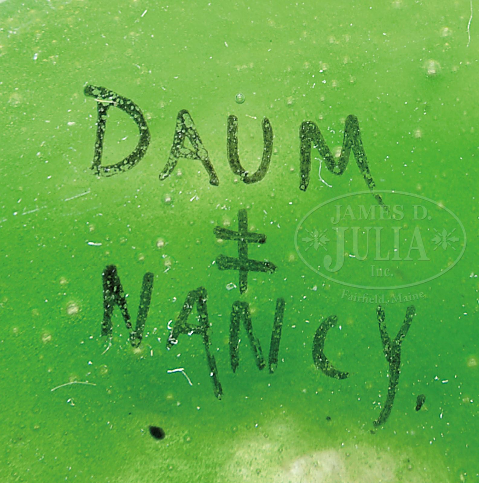 DAUM RAIN SCENE VASE. Daum vase is decorated with cameo windblown trees which are further decorated with black and gray enameling. The trees extend upward from a green enameled ground against a pink shading to frosted sky. The sky is further decorated with cameo streaks of clear polished glass depicting windblown rain. Signed on the underside with engraved signature, “Daum Nancy” with the Cross of Lorraine. SIZE: 6-1/2″ t. CONDITION: Very good to excellent. 5-68125 (6,000-9,000)
