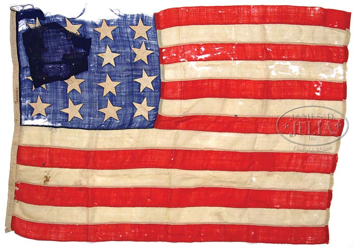 IMPORTANT NOTE: In our original catalog description we indicated that family notes had indicated that this flag came from the U.S.S. Scorpion built in 1813 and used by the U.S. Navy from 1813-1814 on the Great Lakes in the War of 1812. We also noted that at least one flag expert had indicated that there were a couple of construction techniques present in the flag that implied that it could have been made a little bit later in the 19th century. Further research by our flag consultant, John Sexton, has discovered that in the history of the U.S. Navy, there have been six different vessels carrying the name of “Scorpion”; the first built in 1812 which was a block sloop used in the War of 1812 to 1814 as part of Joshua Barney’s Chesapeake Bay flotilla. The second “Scorpion” is the same one referenced in our catalog description. The third “Scorpion” was built in 1847, a bark-rigged steamer of the Mexican-American War and in commission from 1847-1848. There were future “Scorpions”, all of which definitely are not applicable here; one was a patrol yacht and gunboat commissioned in 1898-1899 which was built far too late to have used this flag. Also a Gato-class submarine commissioned from 1942 until it was lost in 1944 – again too late to have used this flag. Finally, a skip-jack class submarine commissioned in 1960 and lost in the Cold War accident in 1968 – again too late. So of the various “Scorpion” vessels that could be considered, the only ones that could be considered are the “Scorpions” built in 1812, in 1813 (which we reference in our catalog) and in 1847. If in fact it is the “Scorpion” built in 1847, this ship has a reasonably interesting and important history. It took part in the Mexican War; it was built in 1846 as a commercial steam ship, “S. S. Aurora” by Bishop and Simonson at New York City. The Navy purchased the Aurora” in January of 1847 for use in the Mexican War and commissioned her as the “U.S.S. Scorpion”. She saw one year of service and then in August of 1848 she was decommissioned and sold at auction. The “Scorpion” itself played an important part in helping to shape the development of the U.S. Naval fleet. At the outbreak of the Mexican War, there was a movement within the Naval Department to transition from sailing vessels to steam vessels; one of the greatest advocates was Matthew Calbraith Perry (1794-1858), he was the younger brother of the famous Oliver Hazard Perry and Matthew, like his older brother, was an important and instrumental figure in the Navy. He had a distinguished service but also, his tremendous advocacy for steam vessels and their benefit to the Navy eventually resulted in his being referred to as the “Father of Steam Powered Fleet”. The “Scorpion”, after being acquired was immediately sent to Mexico to take part in the war. At the time of her arrival, Perry transitioned from the “U.S.S. Mississippi” which he captained to the “U.S.S. Scorpion”, which became the flagship of his squadron. He captured the Mexican city of Frontera, demonstrated against Tabasco and took part in the Tampico expedition. The primary reason for his transition from the “Mississippi” to the “Scorpion” was that the “Scorpion”, a totally steam-powered vessel was capable of doing things that a normal sailing vessel could not. In addition, its draft was very shallow and thus allowed him to travel well up the river to accomplish the various military goals that were set. The usage and ability of the steam-powered vessels by Perry and other Naval officers during the Mexican War, helped to convince the U.S. Navy to transition fully to steam power. Commodore Perry’s distinguished career did not end with the Mexican War, however, in 1852 he embarked from Norfolk, Virginia for Japan in command of a squadron whose goal was to develop a trade treaty with Japan. As pointed out in our earlier catalog description, because of the construction techniques it is possible that the flag was made for the “Scorpion” vessel from the War of 1812 but it also, because of a couple of characteristics in the construction of the flag, it also could possibly have been used on the third “Scorpion” built in 1847 which took part in the Mexican War. In either case, this is a most important flag and the history of the vessels that it could have come off each are distinguished and of historical significance. A truly important American Naval flag!