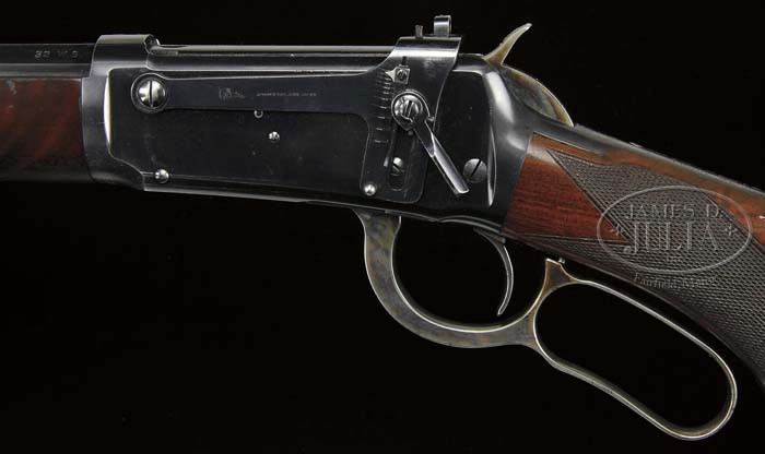 *RARE SPECIAL ORDER WINCHESTER MODEL 1894 LEVER ACTION RIFLE. SN 348629. Cal. 32 Spcl. Fine special order Model ’94 with 26″ oct to rnd bbl, button magazine, globe front sight, no provision for a rear seat with a Lyman 21 rear sight on left side of receiver. Mounted with very highly figured, flame grain, marbled American walnut with “H” style checkered forearm and capped pistol grip with deep fluted sweeping cheekpiece and crescent buttplate. Left side of lower tang is stamped with the assembly number “3159”, “X” and “CP” (presumably this stands for cheek piece). The matching assembly number is also found on buttstock, under buttplate & inside toe of buttplate. Accompanied by two Cody Firearms Museum letters, one dated 1986 and the other 2002, along with a museum yellow sheet. The letters are identical and identify this rifle in 32-40 caliber with oct bbl, plain trigger, checkered stock with pistol grip, Lyman 17 front sight and combination rear sight with no rear seat, half magazine and cheek piece, received in warehouse April 13, 1907 and shipped April 15, 1907 to Order #95992, returned & repaired on Dec. 13, 1910, Order #33324. This is apparently when the bbl was changed to 32 Spcl. Also accompanied by a copy of the Winchester shipping record with the identical information. PROVENANCE: Wes Adams Estate Collection. CONDITION: Very fine to extremely fine. Bbl retains about 98-99% strong, orig factory blue; receiver also retains about 98% strong orig factory blue with light sharp edge wear, some slight thinning on bottom front, flaking on floorplate & top tang with another spot of flaking on top right rear corner of receiver; hammer retains bright case colors on sides and rear edge, faded to silver on top edge; lever retains strong case colors on sides, bright in sheltered areas, nearly faded to silver on outer face; wood is sound with a very few, very minor handling & storage nicks in the finish and some wear on bottom rear edge of forearm at the carry point and overall retains most of its brilliant piano varnish finish. Mechanics are crisp, brilliant shiny bore. 4-44325 JR306 (20,000-28,000)