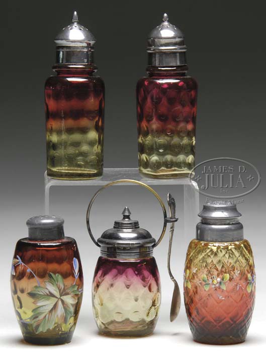 FIVE AMBERINA CONDIMENTS. Lot consists of two amberina inverted thumbprint salt and pepper shakers, an amberina inverted thumbprint mustard jar and two decorated amberina salt and pepper shakers. SIZE: Tallest is 4-1/2″. CONDITION: Very good to excellent with some minor wear to metal components. One shaker lid is loose. 5-63276, 5-63280 (200-300)