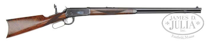 *SCARCE SPECIAL ORDER DELUXE LIGHTWEIGHT WINCHESTER MODEL 1894 LEVER ACTION RIFLE. SN 215804. Cal. 30 WCF (30-30). Beautiful lightweight ’94 with 26″ rapid taper oct bbl, full magazine, tall dovetailed ivory bead front sight which is rare in an extra light bbl, 3-leaf platinum line express rear sight and a Lyman tang sight with large cup disc. Receiver has close coupled dbl set triggers. Mounted with very highly figured, flame grain American walnut with “H” style checkered forearm and straight stock with crescent steel buttplate. Left side of lower tang, under the wood is unmarked. Buttstock has the assembly or SN “18738” and “92” on rear face under the buttplate. Toe of buttplate has a defaced indecipherable number. Accompanied by a Cody Firearms Museum letter identifying this rifle in caliber 30 with extra light oct bbl, set trigger, fancy checkered stock and Lyman front & “rear cup disc”, received in warehouse June 23, 1904 and shipped next day to Order #231741. Also accompanying is a copy of the shipping record. Dbl set triggers are not mentioned in the letter. PROVENANCE: Wes Adams Estate Collection. CONDITION: Very fine. Bbl & magazine tube retain 98-99% strong orig blue with only faint sharp edge wear on the bbl; receiver retains about 96% strong orig blue with very light sharp edge wear and thinning around carry point; hammer retains virtually all of its orig case colors; lever retains most of its brilliant orig case colors, faded on outer face of the loop; wood is sound with a few very light handling & storage nicks & overall retains about all of its bright factory varnish finish. Mechanics are crisp, brilliant shiny bore. 4-44321 (15,000-25,000)