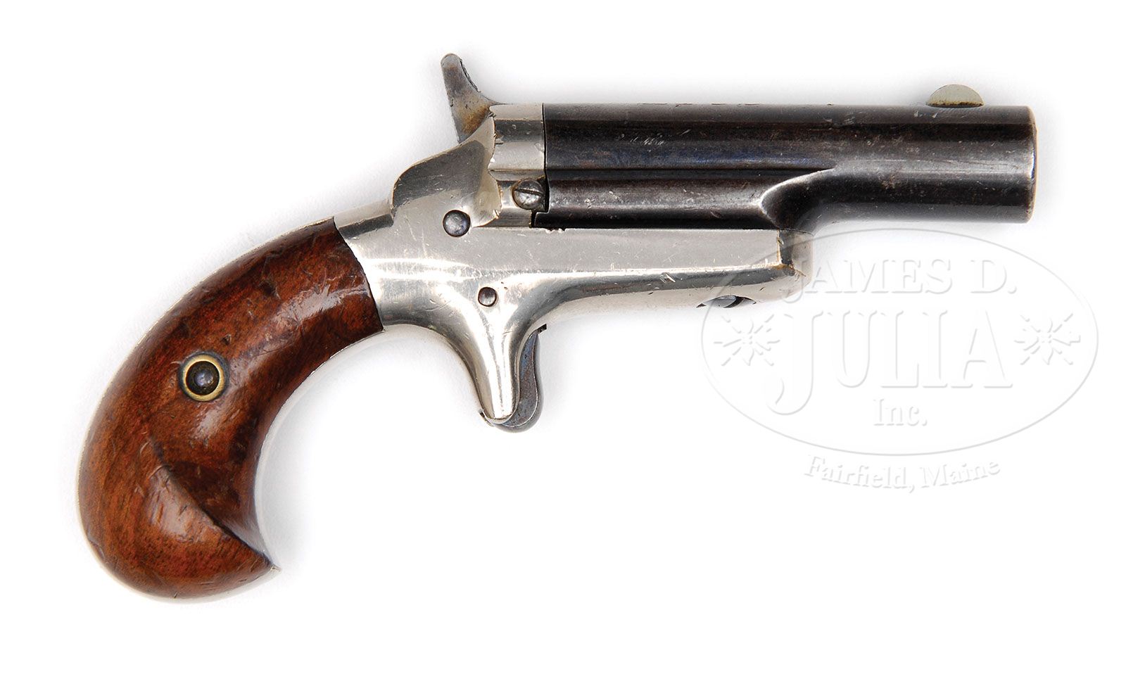 SPECIAL UNIQUE EXPERIMENTAL COLT 3RD MODEL 5TH VARIATION DERINGER. SN 45416. 41 cal. short rim fire. Designed to have a stronger locking latch with a special steel insert held in place by a screw into the brass frame to give the locking bolt more strength. This piece was made towards the end of the production, circa 1915. It was sold in England & has proofs. It has a high hammer for which there is no explanation, other than when assembled at Hartford they were using what they had on hand. This piece was modified at the recoil shield. There is a metal insert milled into the recoil shield where the locking bolt touches that area. It is held in place with a screw that can be seen externally. Apparently, someone thought that the new ammo coming out might need that area to be extra strong. PROVENANCE: William Locke Collection, Malcolm Aterburn Collection, L.D. Eberhart Collection. CONDITION: The blued bbl which has English proofs has 90% of the orig bright blue remaining, with some wear on the edges & at the muzzle & some small flaking around the Colt logo. The nickel frame which has 98% of the orig nickel finish remaining does have some nicks & scratches showing use but no abuse. The left side of the frame is stamped “41 CAL.”. The gun is a 5th Variation, probably made 20-odd years after the first 3 variations of this gun (all of which had high hammers). There is no explanation for the fact that this gun has a high hammer other than the fact that Colt sometimes used whatever was at hand around the shop to complete the gun. Since this was an experimental model which never did go into production, they probably didn’t care. Then it was shipped off to London, to their 14 Pell Mell store, to be sold in England. 90% case color remains on the high hammer, 70% blue remains on the trigger. The grips which are walnut have some nicks & dings but retain 90% of their orig varnish & are still bright & not oil stained. 4-47449 DE69 (2,500-3,500)