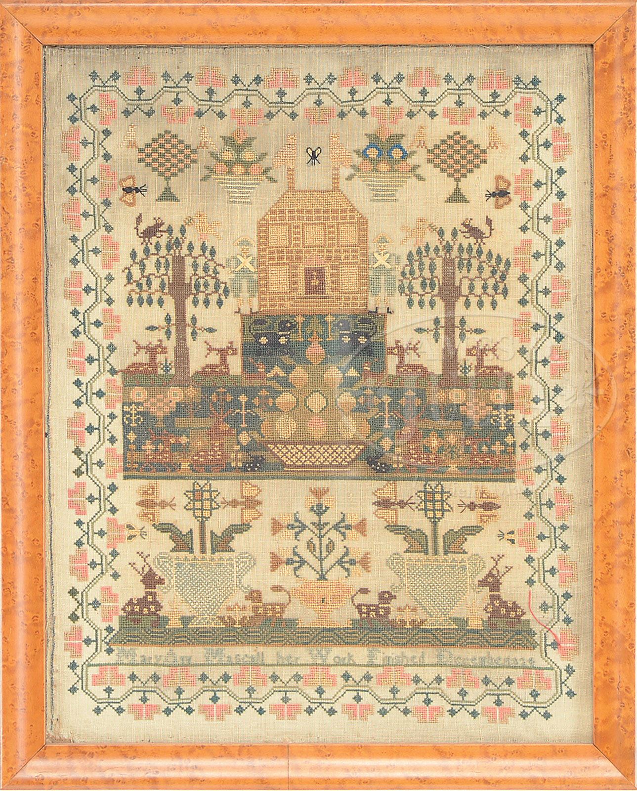 FINE EARLY 19TH CENTURY PICTORAL SAMPLER. Circa 1824, possibly England. This fine example of petit point depicting a stone manor house flanked by soldiers on a fanciful treed and floral landscape peopled with deer, birds and butterflies, etc. Within an arrangement of floral filled urns in a zigzag vinery borders. At the base of the work is wrought “Maryann Mascall her Work Finished December 1824”. Mounted in a bird’s eye maple frame. SIZE: 15-1/4″ x 12″ sight. PROVENANCE: From a fine Augusta, Maine estate. CONDITION: With overall toning, but remains structurally very good. Some weaknesses and minor loss along edges. Colors remain strong. 9-29336 (1,800-2,200)
