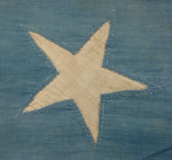 RARE 8 STAR CONFEDERATE 1ST NATIONAL FLAG WITH SAINT ANDREW’S CROSS IN CANTON. This flag can be dated quite accurately between April 17 and May 6, 1861 as Virginia was the 8th state to secede from the Union on April 17th and Arkansas was the 9th state on May 6, 1861. Most Confederate flags are 11 star, made late in 1861 or after all states had seceded but with all the patriotic fervor in the South lots of Confederate variances occurred. This flag, measuring 38″ x 66″, has an intriguing history in that it had remained in the same family for multiple generations. The flag is shown in an April 11, 1920 “Times-Picayune”, New Orleans, newspaper article titled “The Betsy Ross of the Confederacy”. A copy of the article which accompanies this flag states Mrs. E.O. Jones of Algiers, Louisiana made this first Confederate flag for the “PELICAN VOLUNTEER FIREMEN” which served as a New Orleans militia unit. Pictured with the flag in the article are Mrs. Jones’ seven grandsons who were at that time serving in WWI. This flag stayed in the family of the oldest grandson who was again pictured with the flag and his grandson circa 1950 in a Brooklyn newspaper. The flag was recently acquired in Brooklyn from this 5th generation descendent of Mrs. E.O. Jones who originally made this flag in 1861. The story of how this flag was saved from the occupying Union troops by Mrs. Jones is detailed in the articles. This wonderful flag has the stars arranged like a St. Andrews cross which is unique in an 8 star flag. Flag is also made of polished cotton, which is a rare material outside early war flags such as this. This is among the finest and best provenanced flags that will ever be offered. The esthetics and appearance of this canton can never be duplicated. CONDITION: Flag overall is in very good condition. The 1-1/4″ folded hoist is made of linen sheeting with two hand sewn whipped eyelets on either end. 4″ cotton stars are cut through, producing a slightly smaller star with a haloed appearance from the sewing thread. Colors are very good and much better and brighter than normally seen on surviving cotton flags. There is scattered staining, soiling and separations, especially near the fly end. There is one 5″ to 6″ tear in white stripe near fly. Much of the material is still there however, just folded under. 4-46535 JS61 (40,000-60,000)