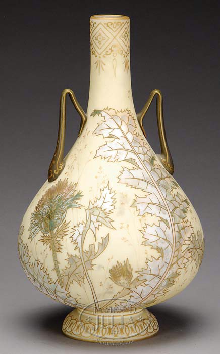 CROWN MILANO HANDLED VASE. Exceptional Crown Milano vase has lovely hand painted thistle decoration against a soft yellow background. The bulbous body gives way to a slender neck which is decorated with a gold gilt geometric and floral design. Vase is finished with two fine applied glass handles with dark olive background and gold filigree decoration. SIZE: 13-1/2″ t. CONDITION: Very good to excellent. 5-68441 (2,500-3,500)