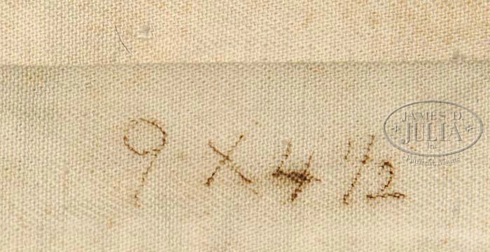 LARGE 19th CENTURY 13 STAR NAVAL FLAG. The white stars are hand sewn onto the blue canton with canvas hoist having brass grommets with two alternating red and white stripes. The name “ARP DECATUR” is written in period ink on the hoist. Arp Decatur is for Anna Rowell Philbrick Decatur, this flag was her husband’s who was a career naval officer holding the rank of Lieutenant in 1841, Commander in 1861, in 1867 he attained the rank of captain and in 1869 the rank of Commodore. Commodore Decatur was the son of John Pine Decatur and nephew of his famous namesake. SIZE: 53-1/2” on the hoist. 97” on the fly. CONDITION: Flag has seen plenty of use and has scattered “mothing” throughout, stains and some discoloration. A portion of all of the stripes have been replaced many, many years ago. 9-97959-8 (1,000-1,500)